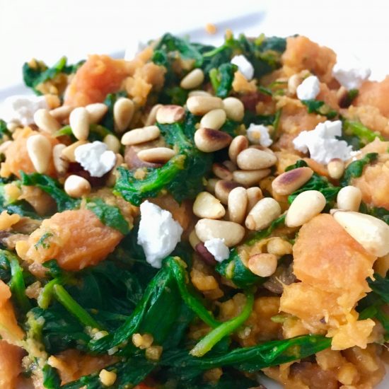 Ingrediënten (voor 2 personen): 2 grote zoete aardappelen 300g verse spinazie bakje kasta